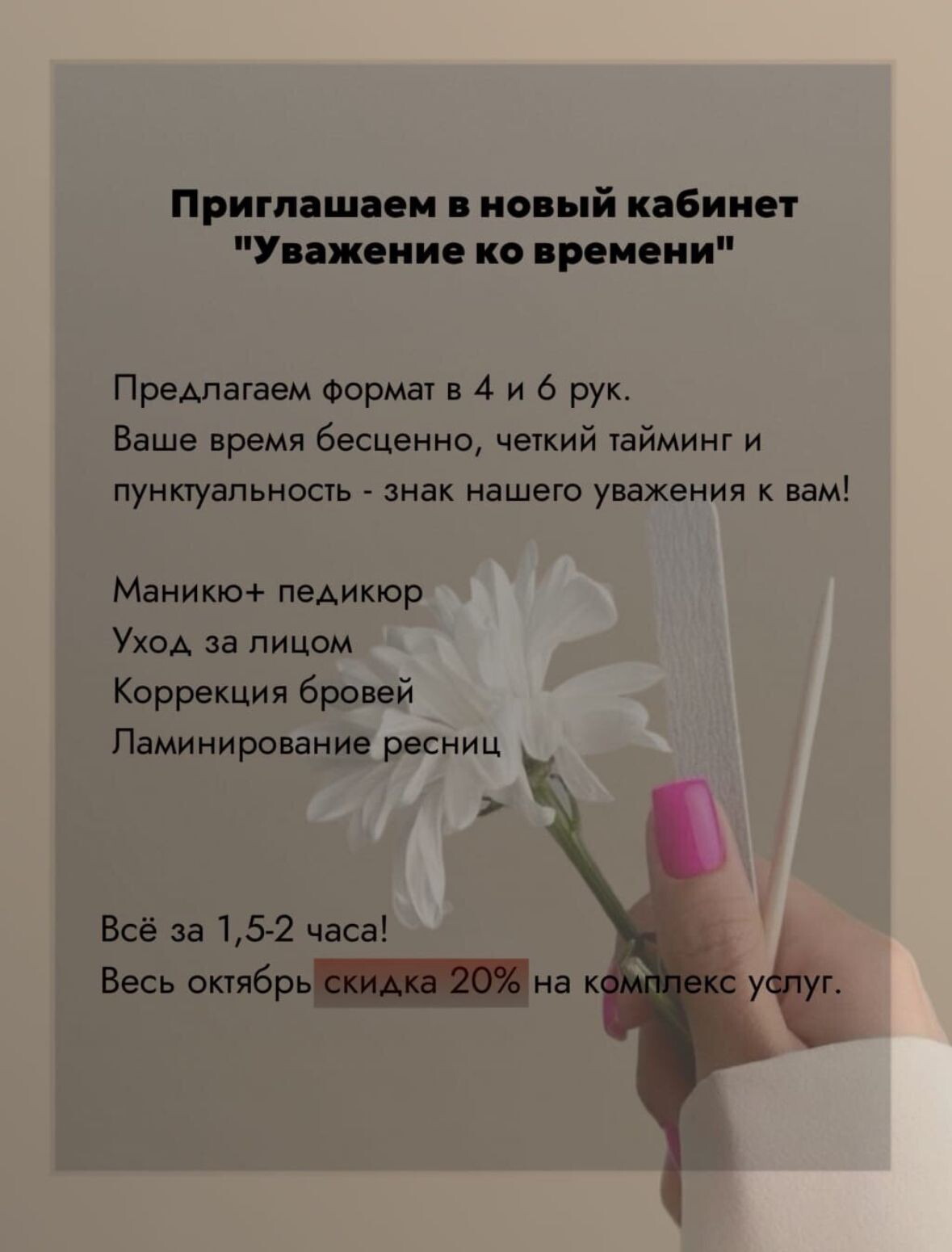 Прихожу делать маникюр с покрытием, обращаюсь уже очень давно к мастеру Наталье и мне очень нравится. Мастер шикарно делает маникюр, общается хорошо, процесс проходит очень комфортно, форму всегда делаю квадрат, Наталья всегда учитывает мои пожелания. В салон я пришла за мастером.